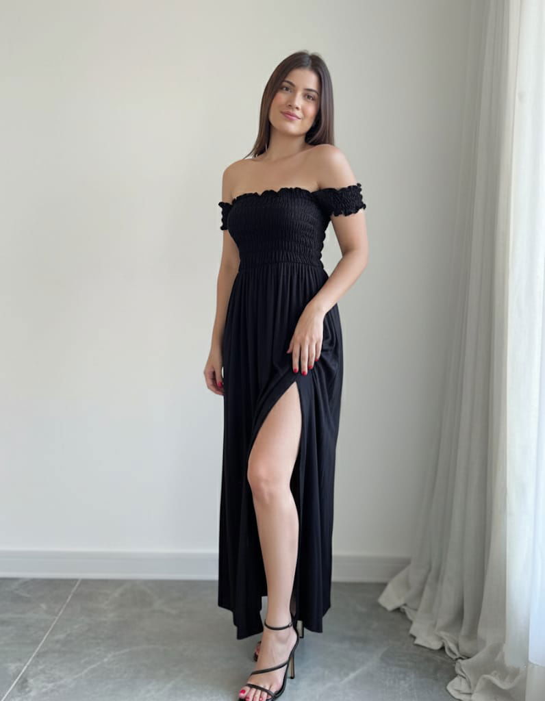 ➤ Vestido tipo paisana con frunce en busto, espalda y mangas, para usar con hombros descubiertos. La falda tiene abertura lateral para mayor comodidad y movimiento